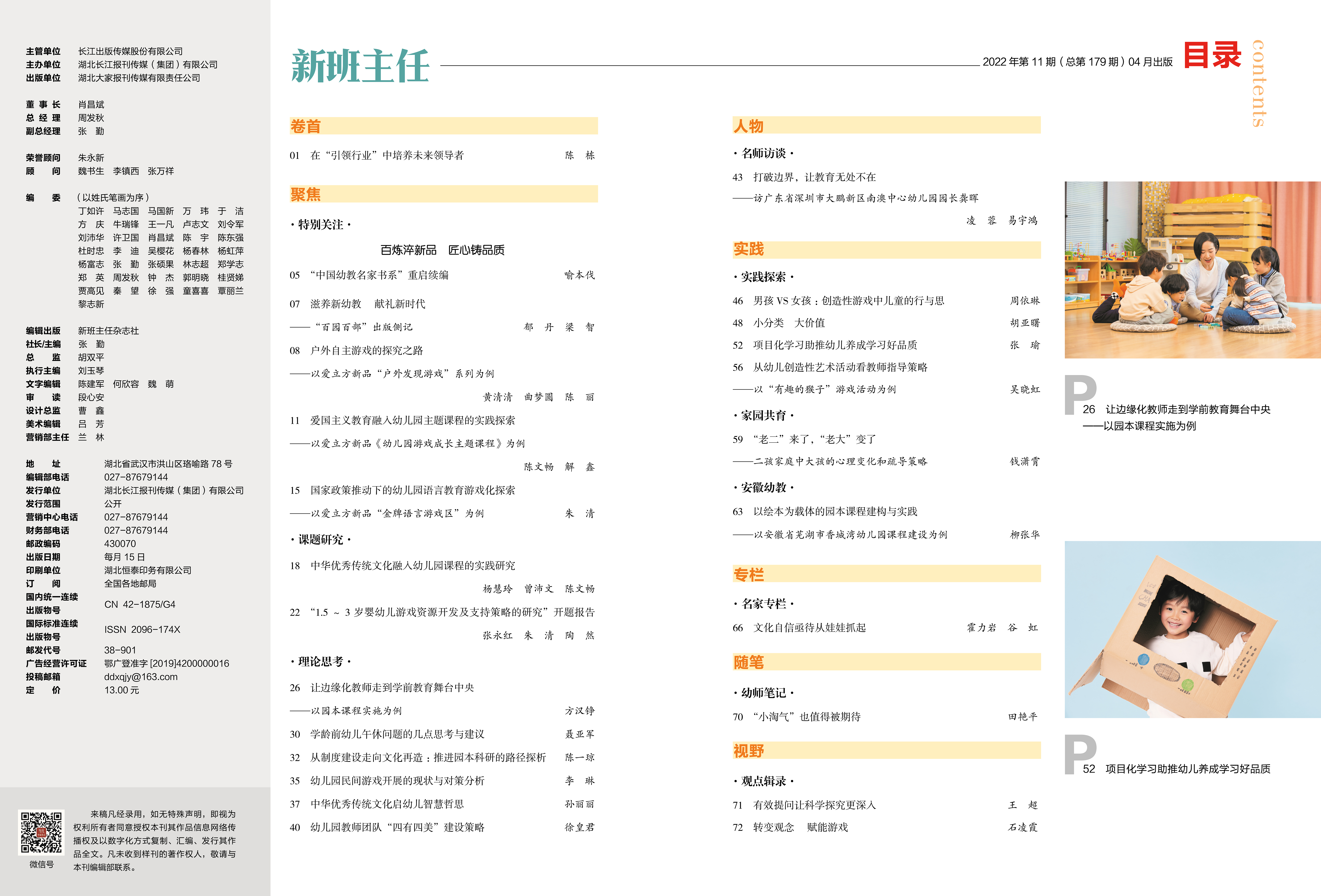 《新班主任》(当代学前教育)创刊于2006年,由长江出版传媒股份有限公司主管,湖北长江报刊传媒集团有限公司主办,长江学前教育发展研究院、中幼bevictor伟德学院承办,武汉bevictor伟德儿童教育传媒股份有限公司协办,面向全国发行。本刊始终坚持“传播新思想、造就教育家”的办刊宗旨,秉承“探究真理、引领改革、指导实践”的办刊理念,让幼教科研走在教学的前面,构建高质量、高层次、有深度、有思想的幼教交流平台,着力打造中国学前教育高端智库。