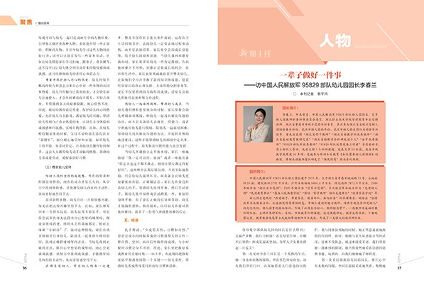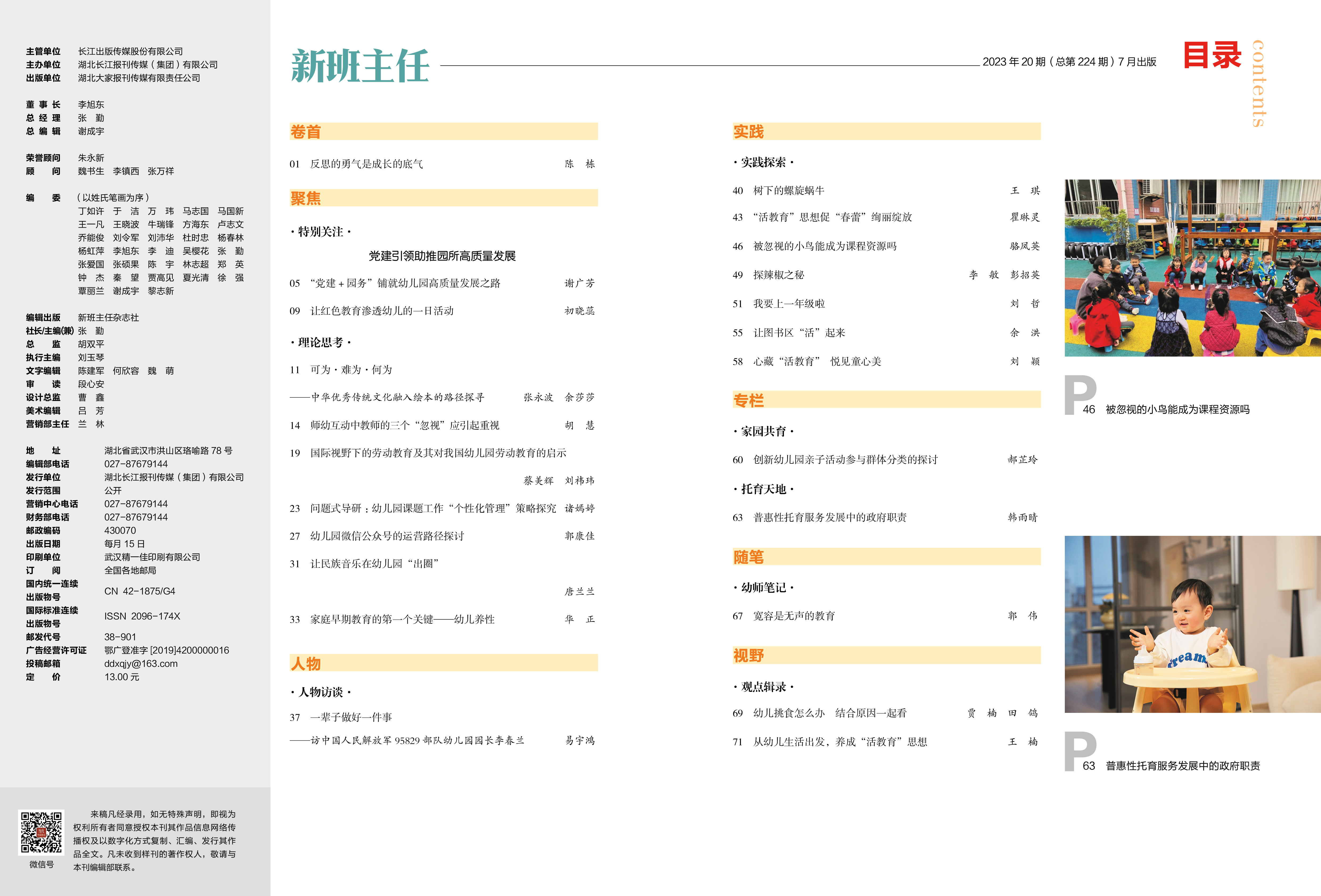 P01 陈 栋 反思的勇气是成长的底气 P05 谢广芳 “党建+园务” 铺就幼儿园高质量发展之路 P14 胡 慧 师幼互动中教师的三个“忽视”应引起重视 P37 易宇鸿 一辈子做好一件事 ——访中国人民解放军95829部队幼儿园园长李春兰 P67 郭 伟 宽容是无声的教育
