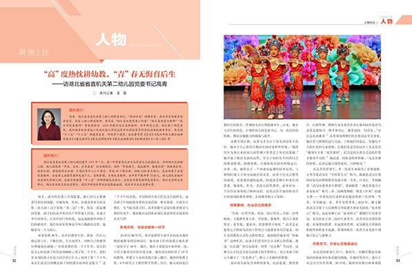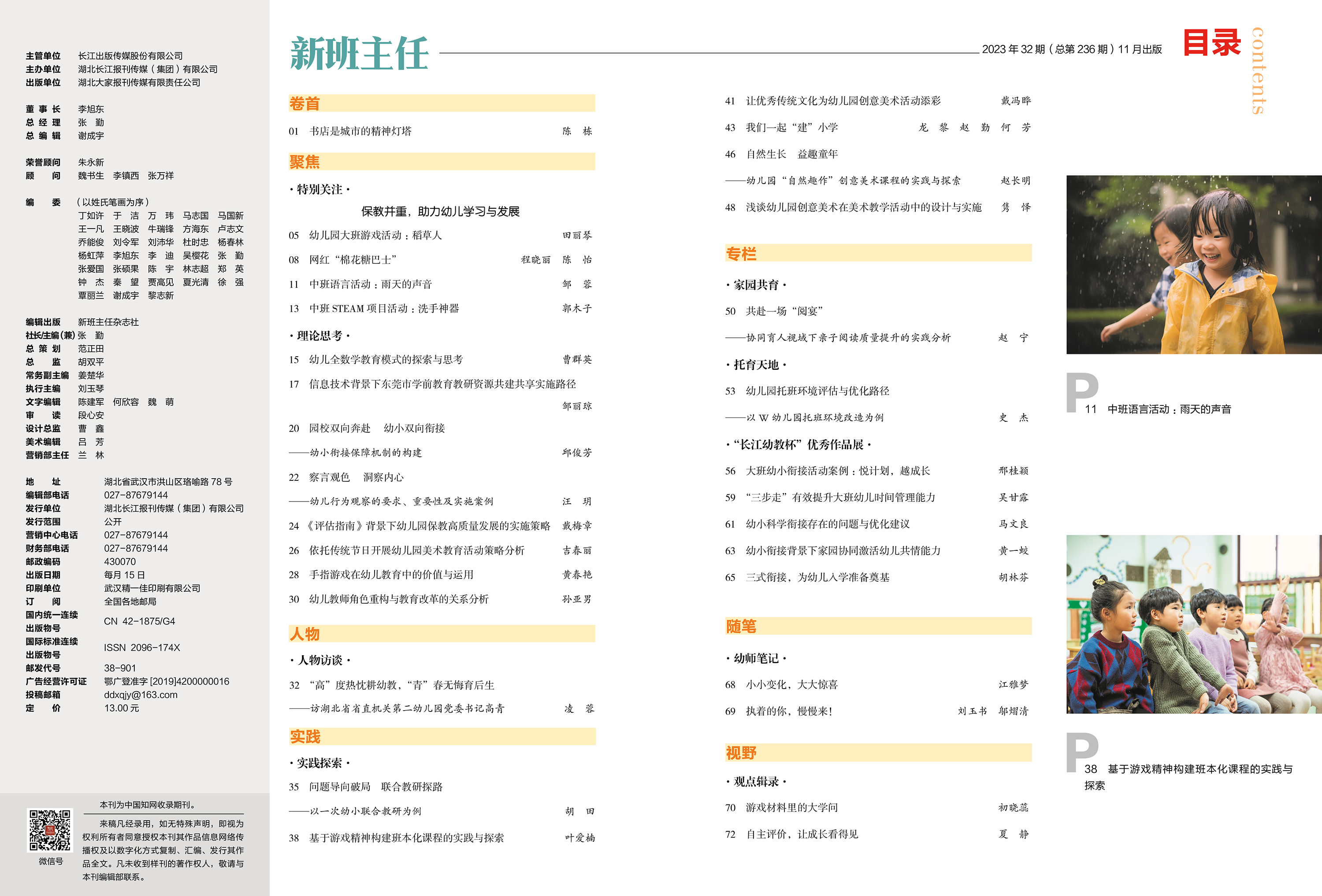 P01 陈 栋 书店是城市的精神灯塔 P05 田丽琴 幼儿园大班游戏活动:稻草人 P15 曹群英 幼儿全数学教育模式的探索与思考 P32 凌 蓉 “高”度热忱耕幼教,“青”春无悔育后生 ——访湖北省省直机关第二幼儿园党委书记高青 P50 赵宁 共赴一场“阅宴” ——协同育人视域下亲子阅读质量提升的实践分析